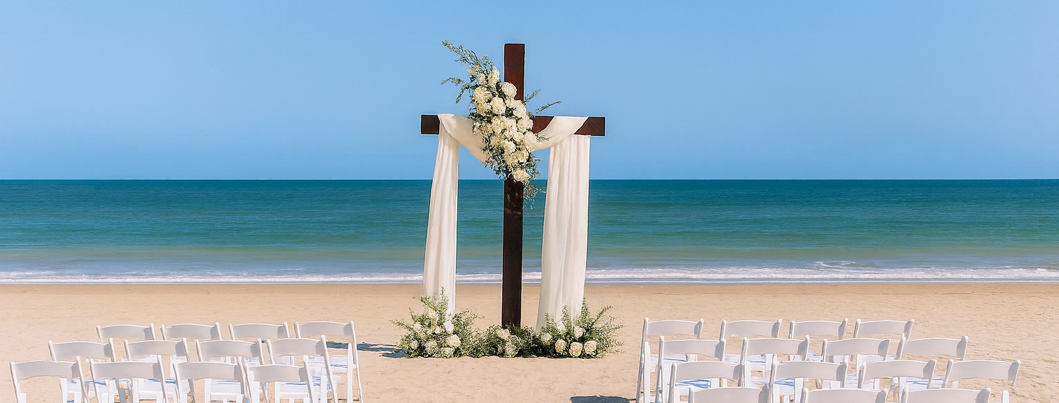All of our beach wedding packages listed below are interchangeable between beach weddings and beach vow renewals. To ensure your day is stress-free, every package includes an officiant to host your ceremony, a photographer, your images downloadable via an online photo gallery, as well as a bridal bouquet of fresh floral. There are even A La Carte enhancements should you want some extra special touches. And if the theme of your dreams is not on our menu, then please allow us the opportunity to customize one for you. Looking for reception Ideas? Click here for more information or contact us today.